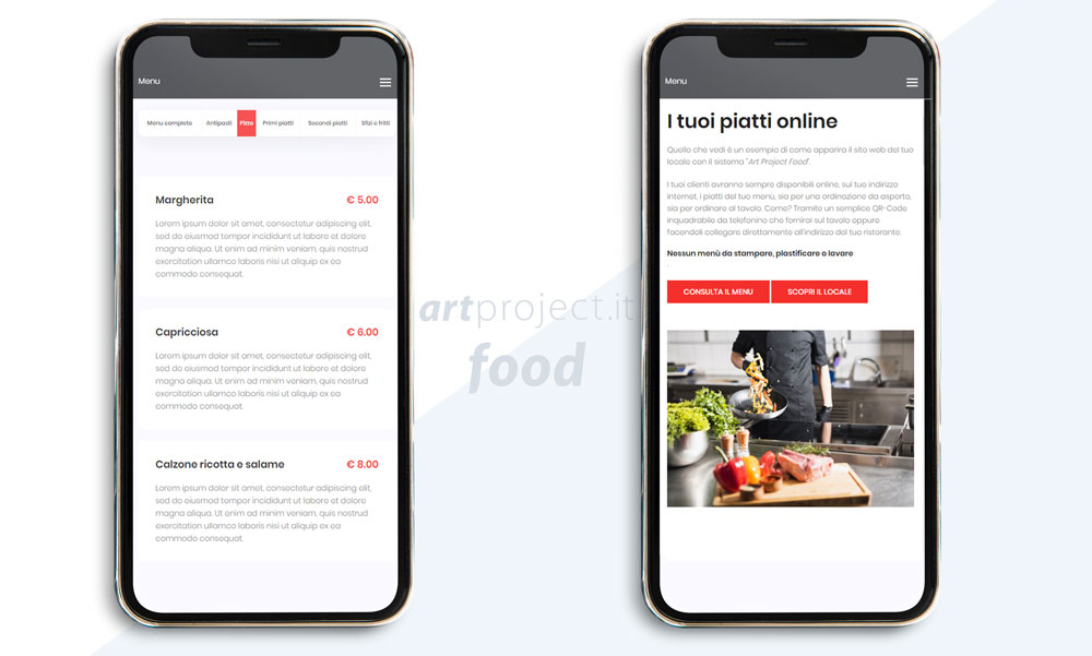 Un sito web responsive, subito pronto per pizzerie, ristoranti e locali con cibo da asporto o per la consultazione veloce del menù al tavolo. Fornisci ai tuoi clienti l'indirizzo del tuo sito web per ordini da asporto oppure fai consultare il tuo menu al tavolo da cellulare con un semplice QR Code.